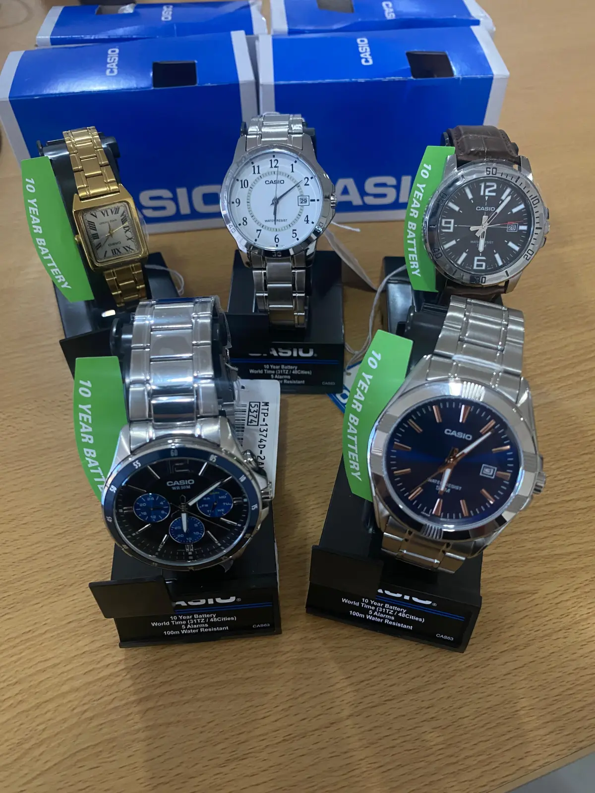 Reloj pulsera Casio con correa de cuero color marrón- bisel plateado